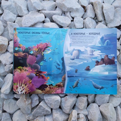 Существуют ли на самом деле морские драконы и единороги? Что такое кораллы? Какое морское животное является самым большим на земле? Что общего у морских коньков и людей? У какой птицы самые длинные крылья? Загляни под створки и узнай много интересных фактов о водных животных и растениях, о пользе, которую приносят океаны людям, о том, какие опасности и секреты хранятся в их темных глубинах и многом другом.