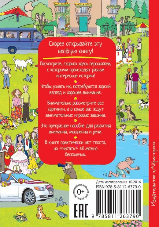 Книга рассказывает об одном летнем дне из жизни маленького городка. Его жители спешат по своим обычным делам, а с некоторыми происходят разные забавные приключения. В книге очень много деталей, и по её страничкам можно бродить бесконечно. Это прекрасное пособие для развития внимания и обучения детей рассказу по картинкам. В конце книги вы найдёте занимательные задания к каждому развороту. Адресовано детям старше 3 лет.