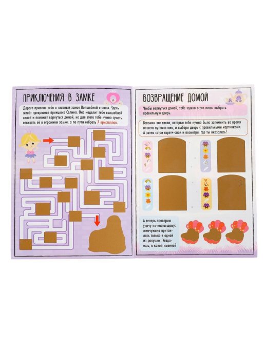 Активити-книга для девочек содержит увлекательные задания и волшебные картинки, спрятанные под скретч-слоем. Сотрите его монеткой и узнайте, что внутри! С книгой девочка отправится в путешествие в сказочную страну! А чтобы вернуться обратно, малышка должна пройти много испытаний и выполнить интересные задания. В книге есть много интересных заданий на тему: "Подбери цветок", "Самый мягкий и пушистый!", "Приключение в замке", "Возращение домой" и др.