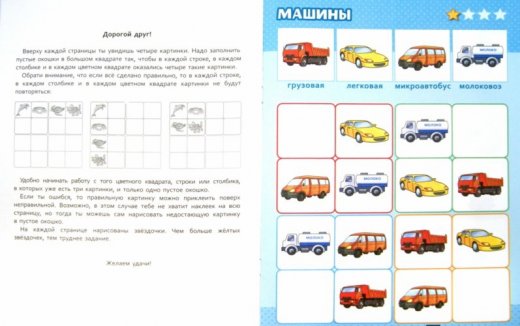 Книжки с наклейками нравятся всем - и взрослым, и детям. Занимаясь по книжке "Судоку для мальчиков с наклейками", ребёнок должен сначала обдумать, какую картинку и куда разместить, попробовать объяснить ход своей мысли, а после выполнения замысла проанализировать, правильно ли всё получилось, и в случае ошибки выбрать другое решение.