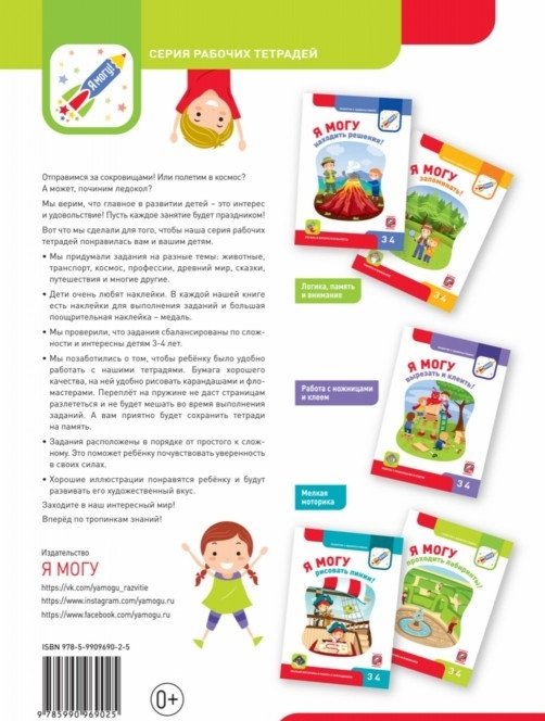 В тетради есть лист с 43 наклейками, которые так нравятся детям. Заламинированные многоразовые наклейки отлично подойдут для малышей. Пособия серии «Я МОГУ!» напечатаны на специально подобранной плотной бумаге, с которой ребёнку будет удобно работать. Все тетради имеют переплёт на пружине, который не даст страницам разлететься и не будет мешать во время выполнения заданий.
