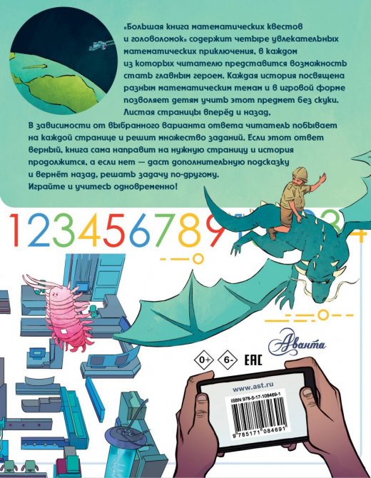 "Большая книга математических квестов и головоломок" содержит четыре увлекательных математических приключения, в каждом из которых читателю представится возможность стать главным героем. Каждая история посвящена разным математическим темам и в игровой форме позволяет детям учить этот предмет без скуки. Листая страницы вперёд и назад, в зависимости от выбранного варианта ответа, читатель побывает на каждой странице и решит множество заданий. Если этот ответ верный, книга сама направит на нужную страницу и история продолжится, а если нет - даст дополнительную подсказку и вернёт назад, решать задачу по-другому. Играйте и учитесь одновременно!