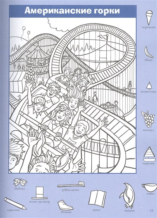 Издательство Highlights Press - лидер книжного рынка по изданию развивающих головоломок — представляет свой самый популярный и абсолютно новаторский на нашем рынке жанр "Hidden Pictures" - Спрятанные картинки. Это не просто выискивание спрятанных на иллюстрации предметов, а захватывающий поиск картинок, искусно встроенных художником в рисунки. Чашка в пальме, крыша-книга, нос-половник, галстук-шишка, рыбка в облаке, хот-дог на шляпе... Картинки, спрятанные в других картинках! Невозможно остановиться, пока не найдёшь все!