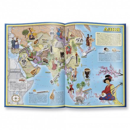 Купить Атлас мира с наклейками Музыкальные инструменты в Новосибирске Вы можете в магазине развивающих и настольных игр "Игры Почемучек".