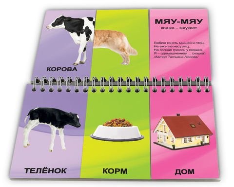 Книга-пазл включает в себя 11 домашних животных, 11 детёнышей, 11 загадок, 11 мест обитания домашних животных и 11 видов еды: собака, индейка, коза, корова, кошка, крольчиха, курица, лошадь, овца, свинья, утка.