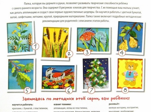 Данное пособие позволяет развивать творческие способности ребёнка с 4 лет. Оно содержит 8 рисунков-эскизов для творчества. С их помощью ваш малыш узнает, как делать аппликацию и создаст свои первые художественные шедевры. Он научится работать с цветной бумагой, ватой, салфетками, нитками, крупой, природными материалами. Пособие также включает подробные методические рекомендации для родителей с описанием этапов работы и цветными фотографиями готовых изделий. Адресовано детям старше 4 лет, их родителям, воспитателям детских садов, руководителям художественных кружков.