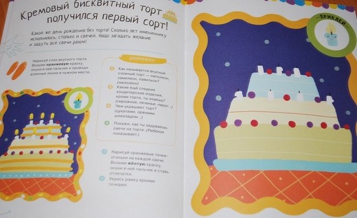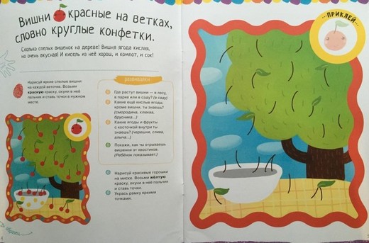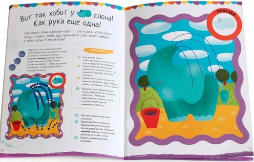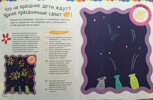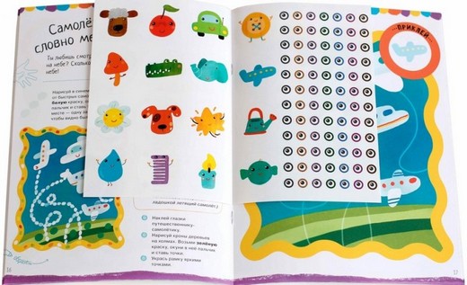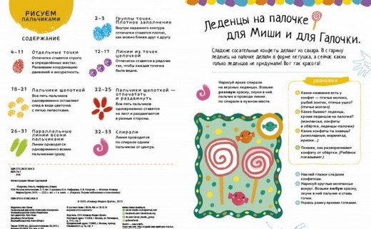 Все малыши обожают рисовать пальчиками. Знаете ли вы, что даже стихийное каляканье красками положительно влияет на развитие ребёнка? Как правило, движения детей к 3 годам становятся более точными: они могут уже рисовать не только хаотичные точки, а группы и цепочки точек, ставить точки в заданных местах; не только печатать пальчиком, но и проводить им линии различной длины и траектории, дорисовывать линии и рисовать по образцу. Поэтому мы постарались подготовить книжку так, чтобы маленький художник мог попробовать себя в разных видах рисования, а в итоге всегда получал красивый готовый рисунок.