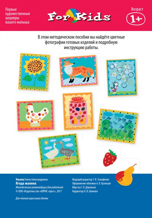 Пособие мастерская малыша "Ягода-малина от года" позволяет развивать творческие способности ребёнка с 1 года. Оно содержит 8 рисунков-эскизов для творчества. С их помощью ваш малыш легко научится работать с пальчиковыми красками и создаст свои первые художественные шедевры. Он узнает, что рисовать пальчиковыми красками можно с помощью ватной палочки, губки, трафарета и даже моркови.