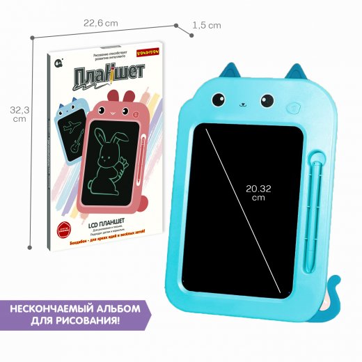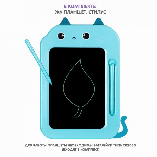 Этот добродушный котик сможет многому научить начинающего художника! Нужно лишь взять в руки перо и включить фантазию, а с остальным поможет котик планшет! Порадуйте ребенка большим голубым ПЛАНШЕТОМ КОТИКОМ с жидкокристаллическим 8-дюймовым одноцветным экраном (монохромные линии) от Bondibon! Удобный компактный гаджет понравится не только детям, но и взрослым, ведь он отлично подходит как для рисования и игр, так и для заметок. В наборе два стилуса – это очень удобно! Рисуйте вдвоем и играйте в крестики нолики, в слова! Делайте записи, не боясь ошибиться. Ведь можно нажать на кнопку и экран снова станет чистым. Вам не понадобятся бумага, карандаши, краски и многое другое. Оригинальный планшет с силиконовыми гнущимися ушками надолго увлечет ребенка и поможет развить мелкую моторику, интеллектуальные способности и творческий потенциал. Замечательный гаджет будет полезен дома и в путешествии. А еще ПЛАНШЕТ КОТИК – отличный подарок для креативных личностей. О качестве и безопасности позаботился Бондибон. В набор входят: планшет, 2 стилуса.