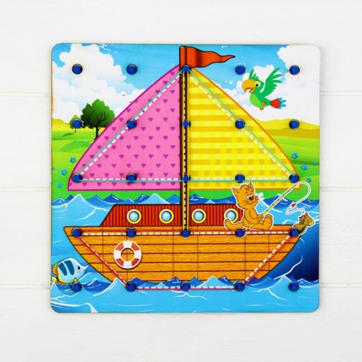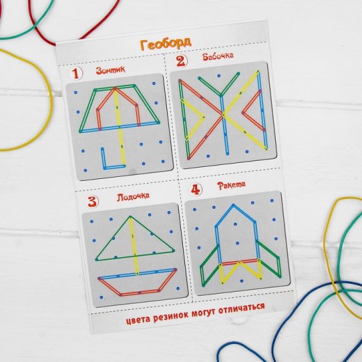 Геоборд - это игрушка для познавательно-математического развития ребенка. Геоборд представляет собой деревянное поле, на котором расположено 25 штырьков (5 рядов и 5 столбцов), 4 накладные тематические изображения-схемы и набор цветных резинок. Задача ребенка на штырьки натягивать резинки для получения всевозможных силуэтных изображений - букв, цифр, геометрических фигур, сюжетных картинок. Ребенок может повторить готовую схему или придумать свое собственное изображение.