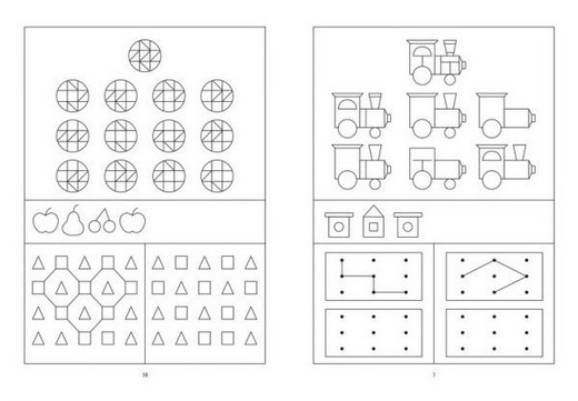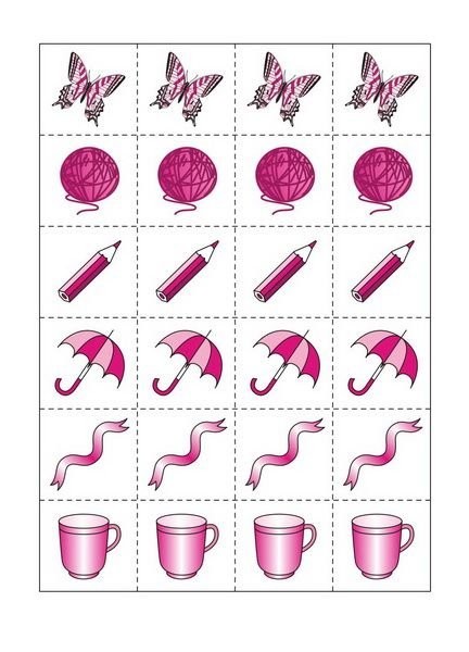 Разрежьте вкладыш по пунктирным линиям, у вас получится 48 карточек, при помощи которых вы сможете предложить ребёнку различные задания: разложите несколько разных карточек в определённом порядке, попросите ребёнка продолжить их выкладывать в том же порядке, не нарушая закономерность; разложите перед ребёнком несколько разных карточек, попросите их запомнить, а затем назвать, не глядя на них. Можно убрать 1-2 карточки или поменять их местами, а затем спросить ребёнка, чего не стало, что изменилось.