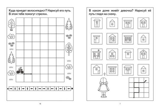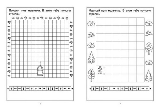 Цветной вкладыш необходимо разрезать по пунктирным линиям. Получится 8 карточек, на которых зашифрованы графические фигурки. Малыш должен изобразить эти фигурки на листе в клетку. Попросить ребенка комментировать во время выполнения задания свои действия, например: одна клетка направо, одна клетка вниз, три клетки налево и т.д.