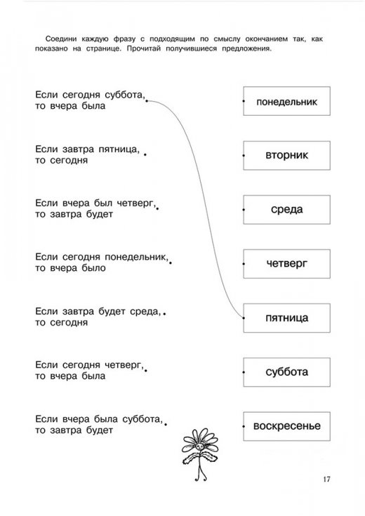 -На странице даны столбики с названиями дней недели. В каждом из столбиков пропущены названия некоторых дней недели. Найди эти названия на странице и соедини с соответствующими местами в столбике так, как показано на странице.