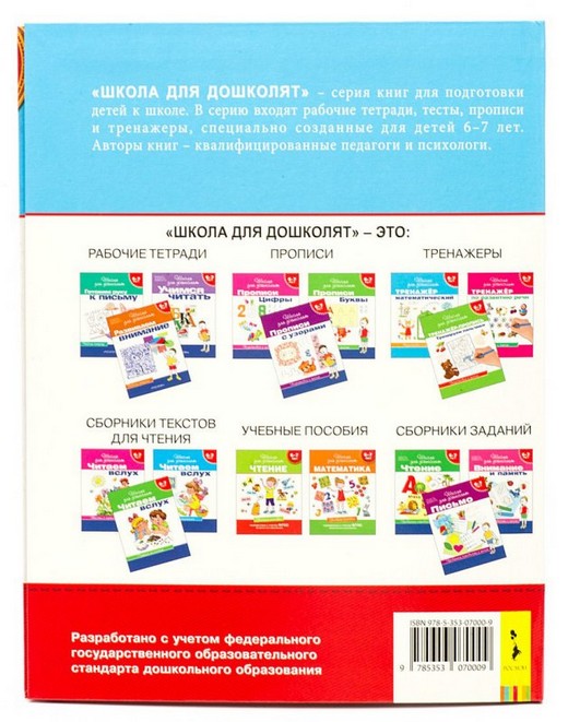 На страницах этого учебного пособия из серии "Школа для дошколят", представленного торговой маркой "Росмэн", родители найдут задания и пояснения к ним от квалифицированных психологов и педагогов. Книга предназначена для занятий с детьми шести-семи лет.