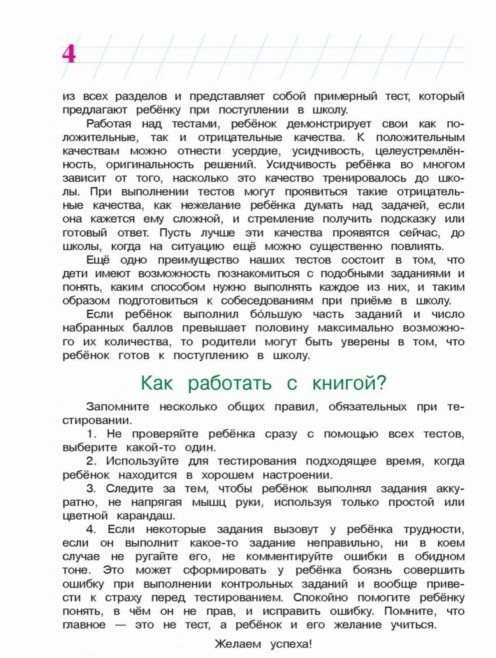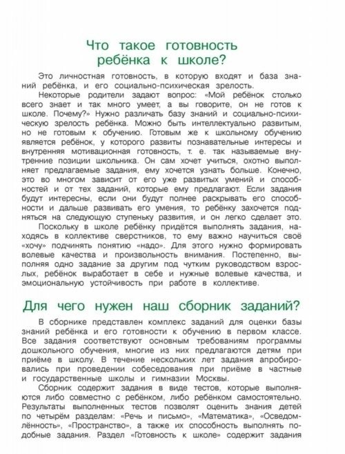 Сборник содержит тесты, которые дети выполняют вместе с родителями. Некоторые задания ребенок должен выполнить самостоятельно. Результаты выполненных тестов позволят оценить знания детей по четырем разделам: «Речь и письмо», «Математика», «Осведомленность», «Пространство», а также их способность выполнять подобные задания. Тесты апробировались в течение нескольких лет при проведении вступительных экзаменов в частные и государственные школы и гимназии Москвы.