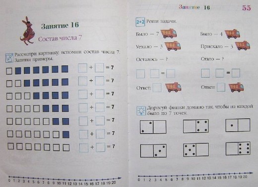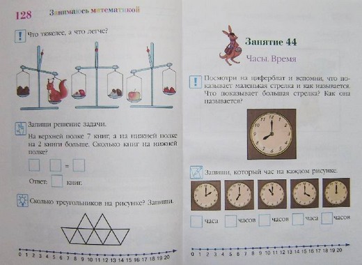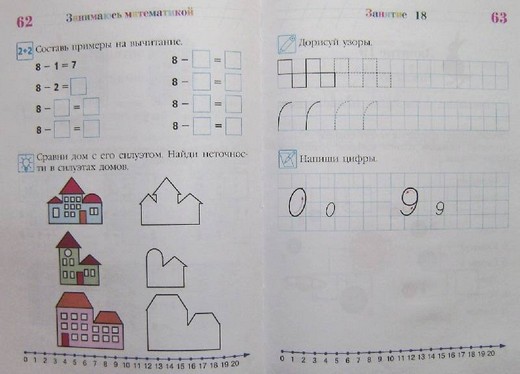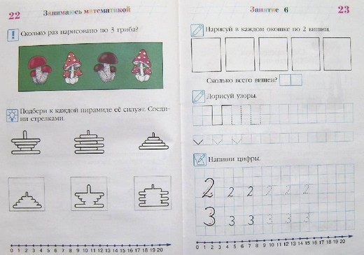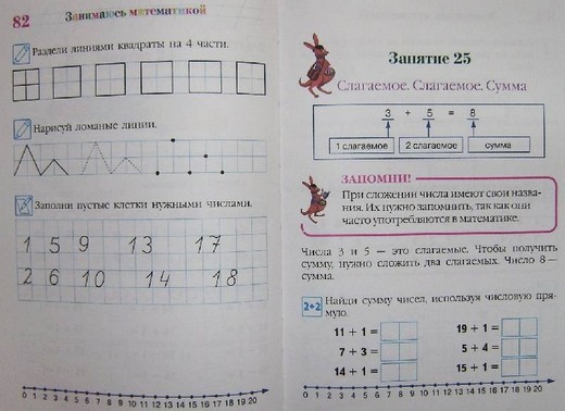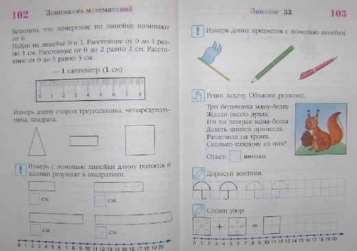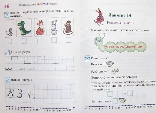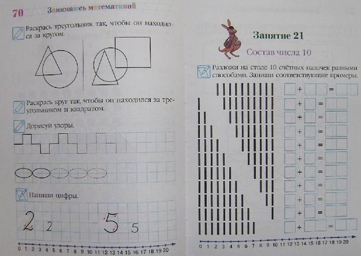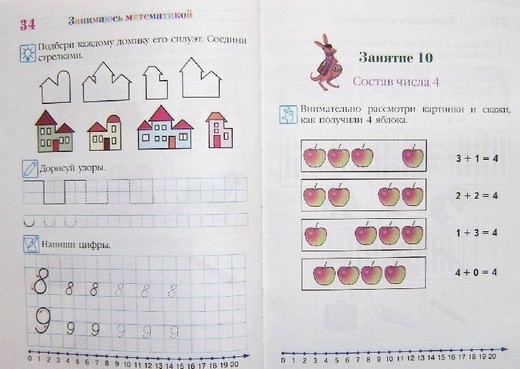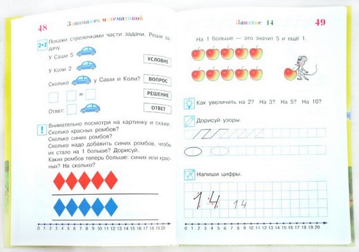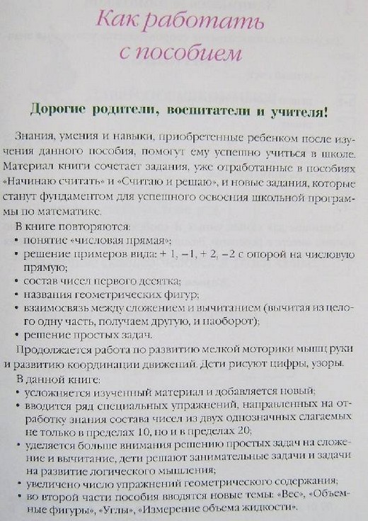Основные задачи пособия – ознакомление ребенка с математическими понятиями «слагаемое», «сумма», «уменьшаемое», «вычитаемое», «разность», «однозначные/двузначные числа», «четные/нечетные числа» и обучение счету десятками, обозначению углов и сторон геометрических фигур, формирование представлений об объемных фигурах.