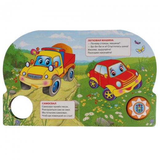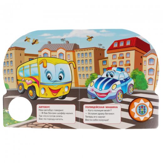 Добрые стихи о машинках, песенки и красочные иллюстрации расширят кругозор ребёнка чтению увлекательным занятием. Малыш будет с удовольствием рассматривать картинки, читать, слушать песню и подпевать. Нажми на кнопку и услышишь песенку, повторное нажатие её отключит. Композиции исполняются профессиональными артистами. Книжка сделана из плотного картона, поэтому родители могут не опасаться за её сохранность. Благодаря компактному формату её удобно взять с собой в дорогу.