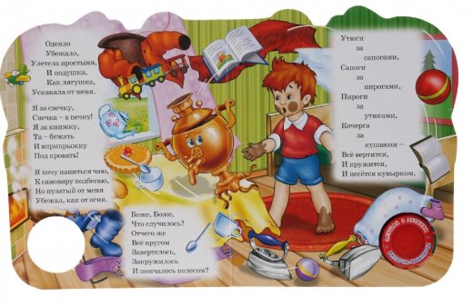 Ребёнок с удовольствием будет листать плотные страницы с яркими картинками, нажимать на кнопку с рисунком и слушать озвученные фрагменты стихотворной сказки Корнея Чуковского. Одно нажатие на кнопку – песенка включится, второе нажатие – выключится и т.д. Книжка сделана из плотного картона, поэтому родители могут не опасаться за её сохранность. Благодаря компактному формату книгу удобно брать с собой в дорогу.