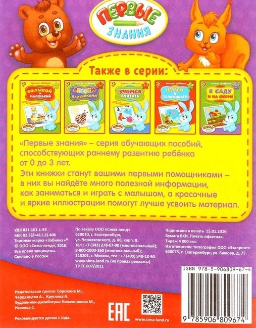 Серия обучающих книг «Первые знания» — это комплексная система занятий с ребёнком. Она делится на три возрастных периода: от 0 до 1 года, от 1 года до 2 лет, от 2 до 3 лет.