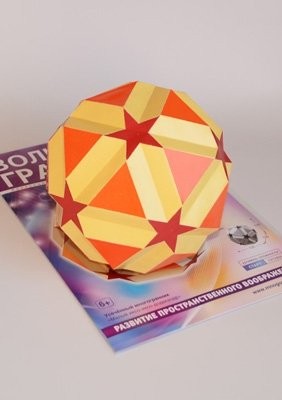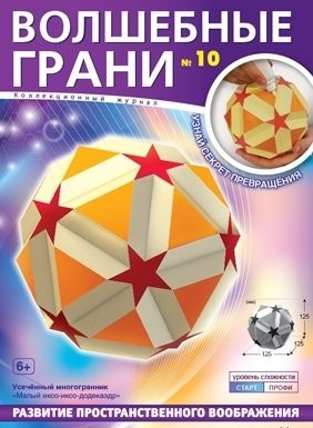 Набор для сборки многогранника: «Малый икосо-икосо додекаэдр». Размеры готового многогранника: 125x125x125 мм. Уровень сложности: «Старт» - не требует дополнительных навыков. "Волшебные грани"-журнал для взрослых и детей о моделях бумажных многогранников. Внутри набора подробная схема сборки с фотографиями с пошаговой инструкцией. За один вечер можно собрать фигуру многогранника целиком. Для работы дополнительно потребуется только клей. Создание моделей многогранников из картона очень увлекательное и доступное занятие, это "магия превращения" листа бумаги в объемную фигуру.