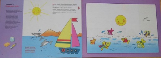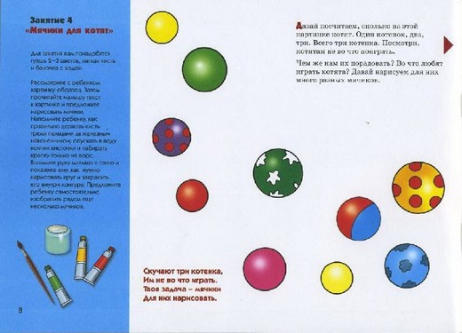 В процессе занятий малыш учится различать и называть цвета: красный, синий, зеленый, желтый, черный, белый. Нарисованные линии в одном случае могут быть дорожками, в другом – нитками для воздушных шариков, в третьем – ступеньками лестницы. Круги могут превратиться в мыльные пузыри, мячики или колеса. Все это способствует формированию художественно-образного мышления. С помощью этой книги ребенок познакомится с возможностями красок, научится изображать простые предметы с помощью поролонового тампона и кисточки. Занятия в книге построены по принципу от простого к сложному. Каждый разворот книги содержит одно занятие. На левой странице разворота объясняется последовательность изображения предмета, даны картинка-образец и текст беседы, который помогает заинтересовать ребенка, вызвать интерес к совместному творчеству, удержать его внимание.