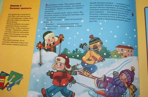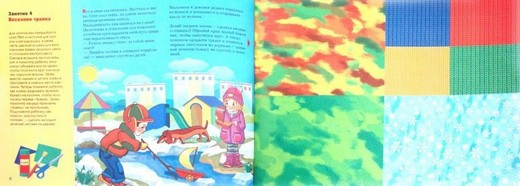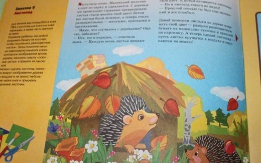 Книга знакомит ребенка с разными временами года, рассказывает об изменениях, происходящих в природе, что обогащает кругозор малыша. Занятия в книге построены по принципу от простого к сложному. Еще есть аппликация, которую ребенок будет наклеивать прямо на страницу книги. Поэтому аппликации надо обязательно дать просохнуть, иначе страницы слипнутся. В середине книги имеется вставка с деталями аппликации.