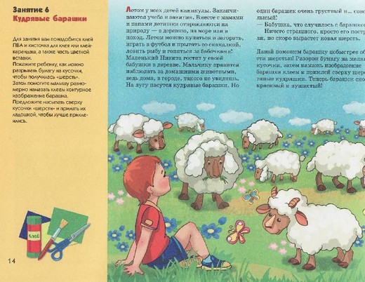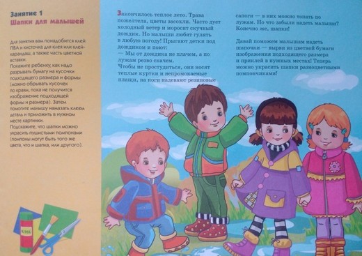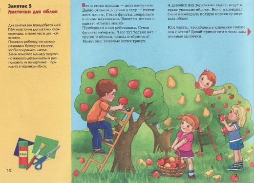 На страницах используется необычный вид аппликации без ножниц, т.к. учить ребенка пользоваться ножницами целесообразно ближе к трем годам. Обрывание картинок по контуру развивает мелкую моторику рук, что способствует развитию мышления.