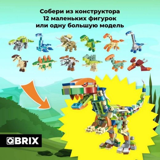 Представляем новинку от QBRIX! QBRIX KIDS – серия ярких детских конструкторов о мире животных. В каждом наборе тебя ждут прикольные существа, которых ты можешь собрать с помощью понятной видеоинструкции с интересными фактами о каждом из них. У тебя получится 12 маленьких фигурок или одна большая! Пошаговые видеоинструкции можно смотреть с любого устройства: телефона, планшета или компьютера. Также в каждый набор вложены бумажные инструкции с понятными схемами сборки. Познавай мир и наслаждайся творчеством вместе с QBRIX! Собери всю коллекцию фигурок из конструктора. Наши наборы обязательно понравятся вашему ребенку и станут любимой игрушкой для мальчиков и девочек. Это отличный способ провести время весело и с пользой. В наборе Мир Динозавров тебя ждут: Плезиозавр Анкилозавр Трицератопс Стегозавр Брахиозавр Паразауролоф Дилофозавр Велоцираптор Теризинозавр Птерозавр Спинозавр Тираннозавр и большой Тираннозавр Рекс. Пластмассовый конструктор состоит из разноцветных элементов, которые легко собираются и разбираются, поэтому он помогает развивать мелкую моторику рук. Набор изготовлен из безопасного ABS пластика без запаха. Мы стараемся делать наши игрушки максимально дешевыми и недорогими при высочайшем качестве. Детский конструктор подойдет почти на любой возраст, на любой вкус и увлечения. Понравится детям, которые любят животных, насекомых, рыбок и жучков. Конструктор от QBRIX – это веселое и познавательное хобби для девочек и мальчиков. Коллекционный набор безопасен для детей, а родителям подарит время для отдыха. Конструктор подойдет мальчикам и девочкам от 6 лет.