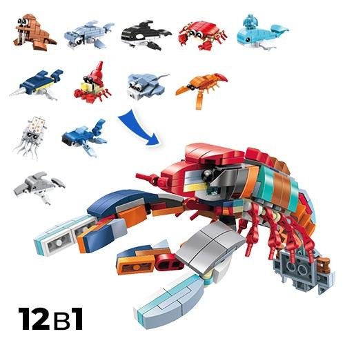 Ребенок с удовольствием собирает 12 фигурок: моржа, акулу-молота, кальмара, летучую рыбу, касатку, дельфина, обычного рака, ската, краба, тунца, рачка-отшельника и кита. Если использовать все компоненты для одной модели, можно смастерить большую королевскую креветку.