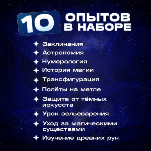Набор для опытов «Эврики» — простые эксперименты, которые помогут продемонстрировать свойства различных химических элементов. Ребёнок сам проведёт 10 опытов и удивит друзей! Список опытов Урок зельеварения. Изучение древних рун. Заклинания. Трансфигурация. История магии. Астрономия. Защита от тёмных искусств. Нумерология. Полёты на метле. Уход за магическими существами.
