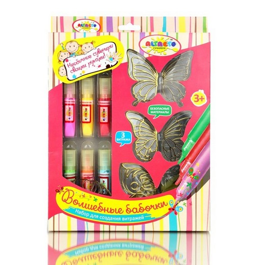 Состав набора: витражи-бабочки- 3 шт, краски витражные- 6 шт. Размер коробки 25см на 20см. Рекомендуемый возраст: от 5-ти лет.