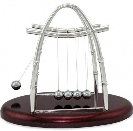 Продолжительность работы такого оригинального подарка напрямую зависит от веса и размера шариков: чем больше их диаметр и чем они тяжелее, тем дольше будет длиться данный процесс, и наоборот. Сам маятник — это механическая система, придуманная Исааком Ньютоном для демонстрации преобразования энергии различных видов друг в друга: кинетической в потенциальную и наоборот. В отсутствие сил трения система могла бы действовать вечно и систему можно было бы назвать вечным двигателем, но в реальности это недостижимо.